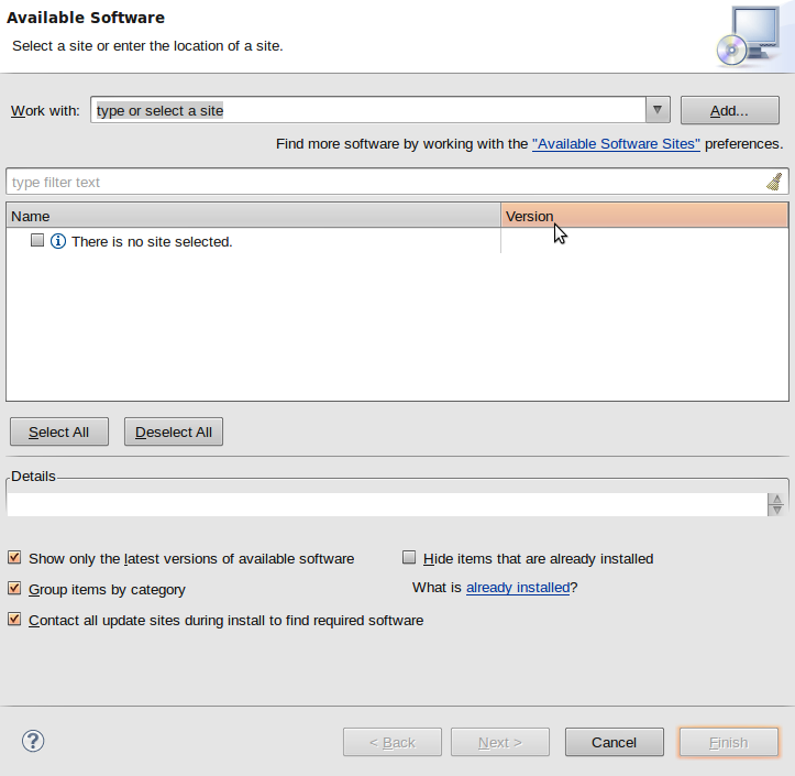 Voltando ao Eclipse, feche a Janela de Welcome (não gosto dela :D). Acesse Help, Install New Software. Abrirá a seguinte janela: